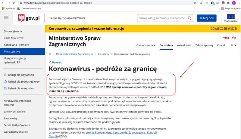 Firmy ubezpieczeniowe obserwują zwykle to, co jest publikowane na stronie internetowej polskiego MSZ. Tymczasem tam wyraźnie zakomunikowano, że rząd w związku z pandemią odradza w tej chwili podróże zagraniczne, jeśli nie są one niezbędnie konieczne.