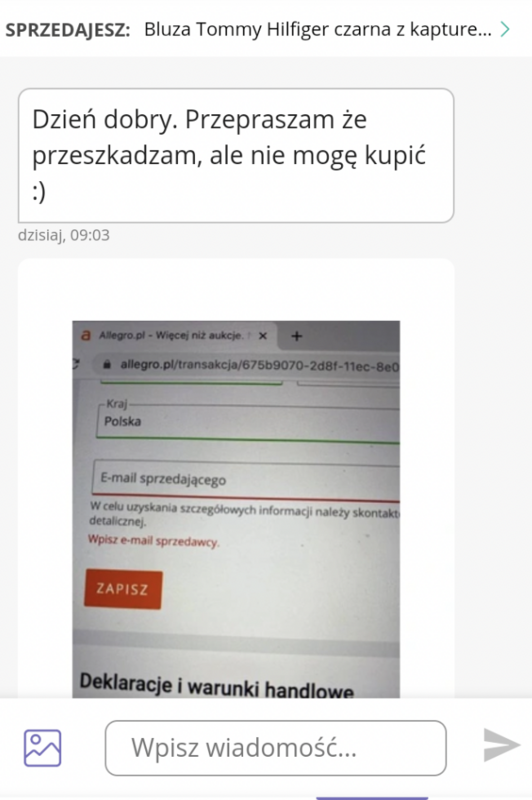 – Wystawiłem dzisiaj na Allegro Lokalnie za pomocą aplikacji mobilnej książkę. Na czacie otrzymałem widomość od osoby, że „chciałaby kupić, ale nie zna mojego maila i załączyła zdjęcie-screen, w którym widnieje "Potwierdzenie wykonania bezpiecznej transakcji" i "Aby kupić teraz za pośrednictwem Allegro, wprowadź adres e-mail sprzedawcy". Ja kilka lat nie wystawiałem już przedmiotów na allegro.pl i jest to moja pierwsza aukcja na Allegro Lokalnie w roli sprzedającego. Dziwne wydaje mi się, że kupujący musi wpisać adres mailowy sprzedającego, żeby dokończyć zakup – opowiada użytkownik Allegro Lokalnie.