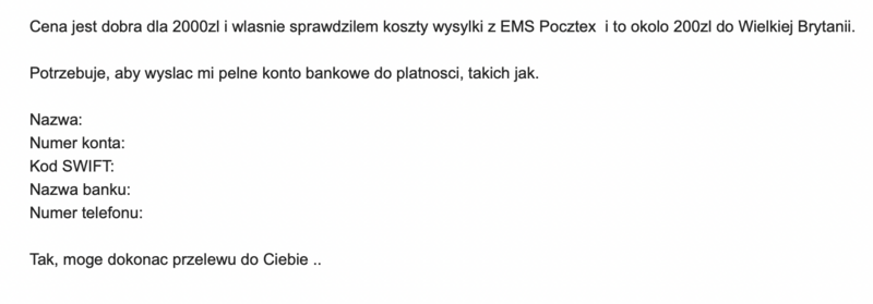 „Cena jest dobra dla 2000zl i wlasnie sprawdzilem koszty wysylki z EMS Pocztex i to okolo 200zl do Wielkiej Brytanii. Potrzebuje, aby wysłać mi pelne konto bankowe do platnosci, takich jak.”.