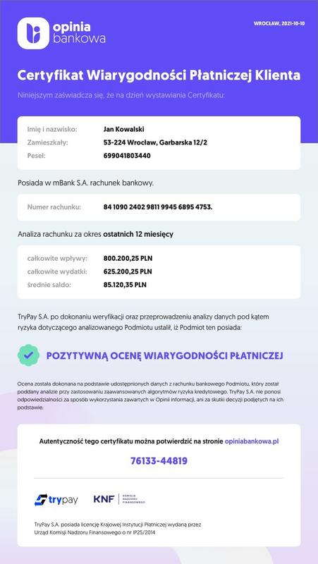 Przy weryfikacji OpiniaBankowa.pl korzysta z możliwości, jakie daje otwarta bankowość. Certyfikat wiarygodności płatniczej jest generowany na podstawie danych z rachunku bankowego klienta czy najemcy, do których firma ma dostęp dzięki usłudze AIS (usługa dostępu do informacji o rachunku bankowym). Usługę tę świadczy TryPay, właściciel portalu OpiniaBankowa.pl, który posiada licencję krajowej instytucji płatniczej.