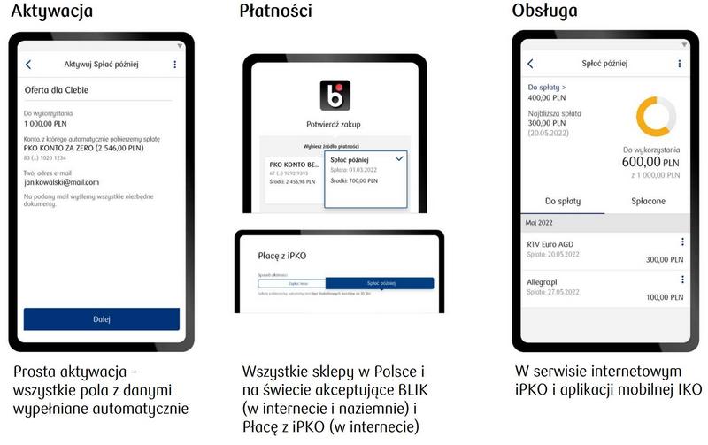 Wynika z niego, że BNPL w PKO BP to "Spłać później". W trakcie aktywacji usługi nie będzie wymagane wprowadzanie dodatkowych danych, tylko akceptacja warunków korzystania z usługi. Następnie klient PKO płacąc za coś w sklepie za pomocą pay by linka lub Blika otrzyma propozycję skorzystania z "Spłać później" w ramach limitu. Moduł do zarządzania usługą znajdować się będzie zarówno w internetowym serwisie transakcyjnym jak i aplikacji mobilnej IKO.
