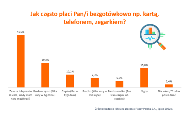 Sondażownia IBRiS na zlecenie Fiserv, właściciela marki PolCard, zapytała respondentów, jak często płacą bezgotówkowo, czyli m.in. kartą, telefonem lub zegarkiem. 41 proc. z badanych korzysta z rozliczeń bezgotówkowych "zawsze lub prawie zawsze", ponad 19 proc. – bardzo często (czyli kilka razy w tygodniu), a 10 proc. – często (raz w tygodniu). Razem to ponad 70 proc. ankietowanych, którzy przynajmniej raz w tygodniu płacą bezgotówkowo.