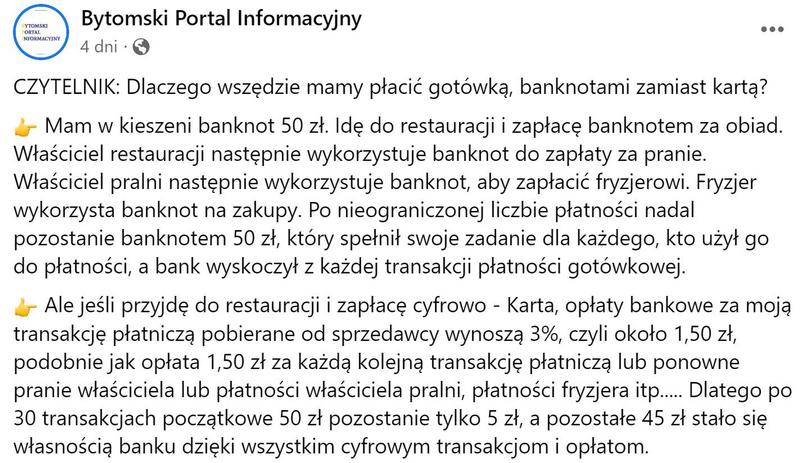 W portalu Facebook natrafiłem na pewien wpis szkalujący płatności elektroniczne i zachwalający transakcje gotówkowe. Stało się tak bo, niestety, pewna osoba z grona moich znajomych postanowiła udostępnić post podany wcześniej dalej przez jeden z lokalnych serwisów informacyjnych. Post wygląda tak: