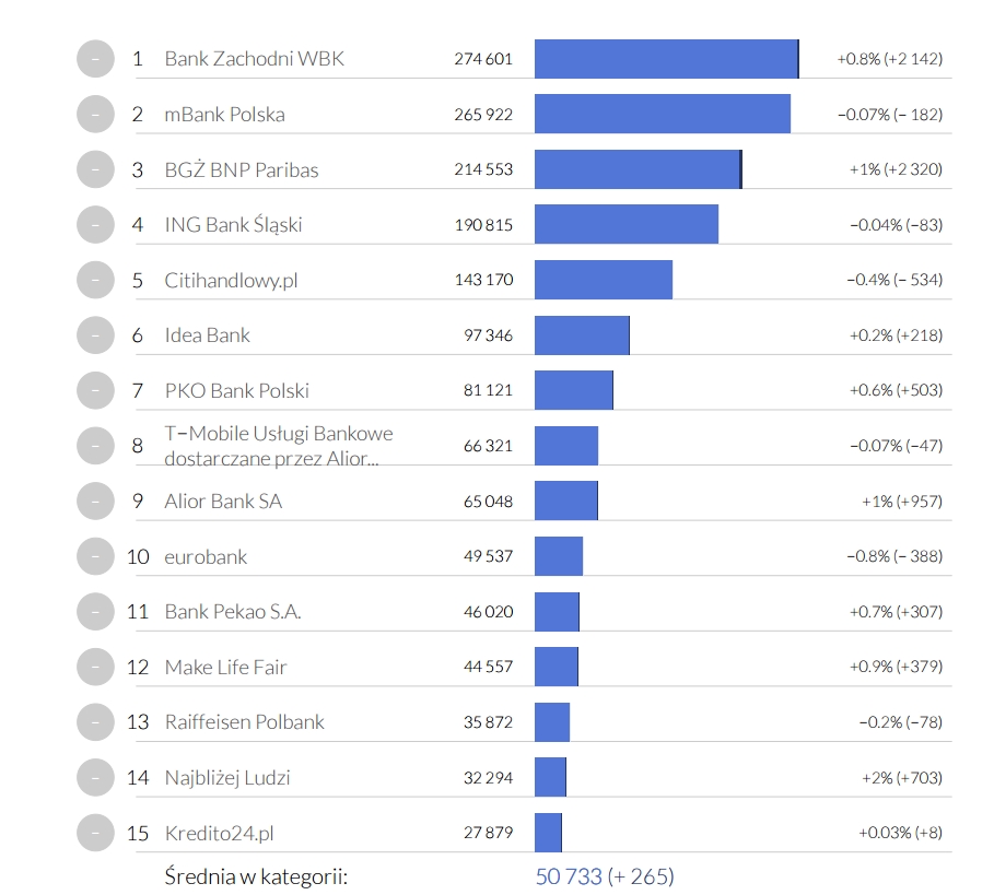 Warto odnotować, że BZ WBK przybyło ponad 2,1 tys. fanów, podczas gdy mBank nieznacznie stracił. Przewaga lidera nad wiceliderem uległa więc powiększeniu. Strony obu instytucji pod względem pozyskania nowych fanów prześcignął tym razem BGŻ BNP Paribas, który przyciągnął ich w ubiegłym miesiącu 2320.