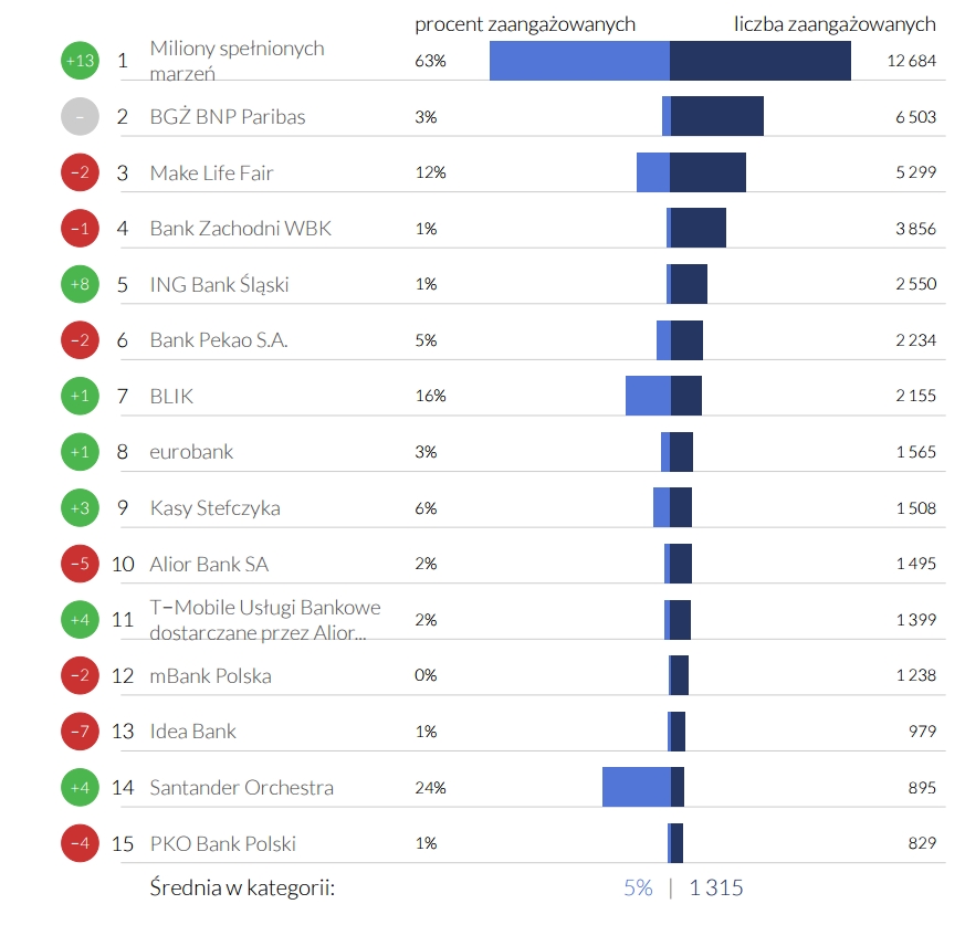 Znacznie ciekawiej wygląda wykres pokazujący strony instytucji finansowych najbardziej angażujących internautów. Tutaj widać ogromne zmiany. Listę otwiera bowiem fanpage Kasy Stefczyka "Miliony spełnionych marzeń", który awansował z 13 pozycji, skłaniając do kliknięcia lubię to, skomentowania lub jakiejkolwiek innej reakcji 63 proc. swoich fanów (profil Kasy Stefczyka ma nieco ponad 20 tys. użytkowników).