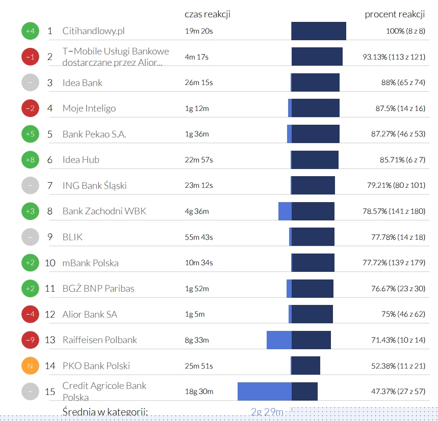 Pod względem obsługi, czyli liczby odpowiedzi na wpisy fanów, tym razem najlepszy był Citi Handlowy, który zareagował na wszystkie wypowiedzi. Ale było ich tylko 8. Najbardziej, bo o osiem pozycji, czyli na 6 miejsce w rankingu, awansował Idea Hub fanpage Idea Banku. Na stronie TMUB, który spadł na drugą pozycję, znalazło się 121 wpisów, z których obsłużono nieco ponad 93 proc. Na tej stronie najszybciej bo średnio w ciągu 4 min. i 17 s. reagowano na posty umieszczane przez fanów.