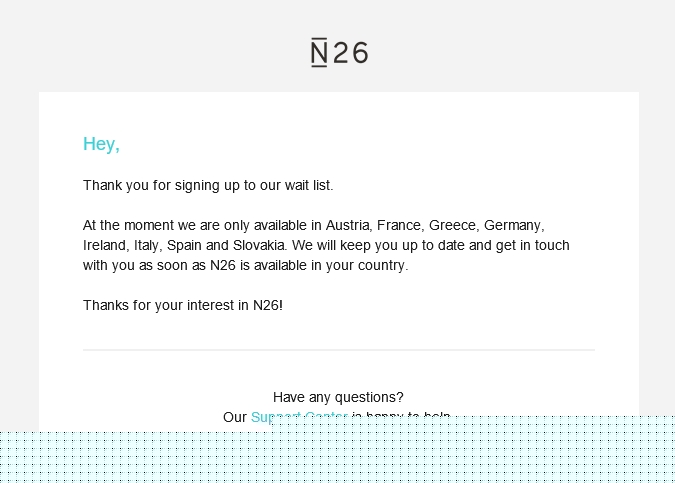 Z usług N26 mogą już korzystać mieszkańcy Austrii, Francji, Grecji, Niemiec, Irlandii, Włoch, Hiszpanii i Słowacji. Chcielibyście założyć konto? Być może już niedługo będziecie mogli.