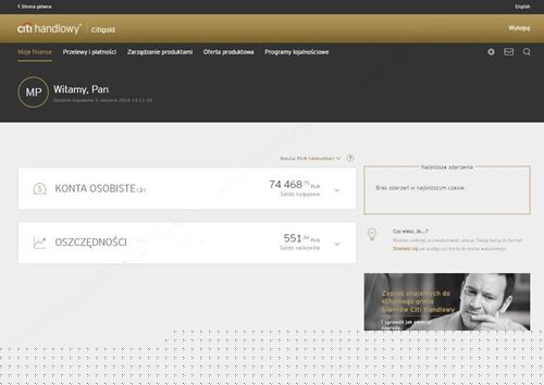Oczywiście nie chodzi mi tylko o zastosowane tu kolory, które wprowadzają dużo spokoju. Stonowane barwy mogą wynikać z grupy docelowej, do której swoje usługi kieruje Citi, pewnie trochę bogatszej i bardziej konserwatywnej niż gros klientów mBanku czy ING. Nie mniej taka a nie inna kolorystyka pozwala skupić się na tym, po co człowiek loguje się na konto, czyli na zarządzaniu pieniędzmi. Nie wiem, jakie są Wasze wrażenia, ale ja, widząc tę stronę pierwszy raz miałem wrażenie, że niczego nie muszę szukać i od razu wiem, gdzie co jest.