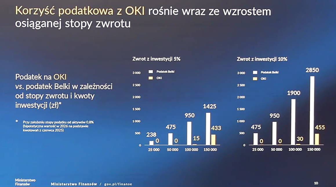 – Propozycja rządu w zakresie wprowadzenia OKI różni się od oczekiwań rynkowych co do obniżki podatku Belki lub innych zmian, w tym wprowadzenia kwoty wolnej od podatku lub czasu posiadania instrumentów finansowych, od którego zależałoby zwolnienie podatkowe. OKI dokłada również nowy podatek, tzw. podatek od aktywów, którego konstrukcja zakłada niskie opodatkowania (poniżej 1 proc.) wartości inwestycji ponad 100 tys. zł. Jest to zasadnicza różnica względem podatku Belki, ponieważ inwestycja jest opodatkowywana nie w momencie realizacji zysku, ale na bieżąco, także jeśli generuje stratę – uzupełnia Konarzewski.