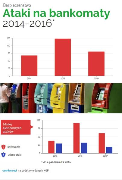 Z danych Komendy Głównej Policji wynika, że właściciele sieci bankomatów mają już chyba za sobą kulminację przestępstw wymierzonych w te urządzenia. KGP podaje, że w 2014 r. złodzieje próbowali okraść bankomaty 68 razy, podczas gdy w roku 2015 takich prób było już prawie dwa razy więcej, czyli 124. Wiele wskazuje jednak na to, że rok 2016 będzie stał pod znakiem spadku liczby ataków na bankomaty. W okresie od 1 stycznia do 4 października 2016 r. policja odnotowała 81 takich przypadków.
