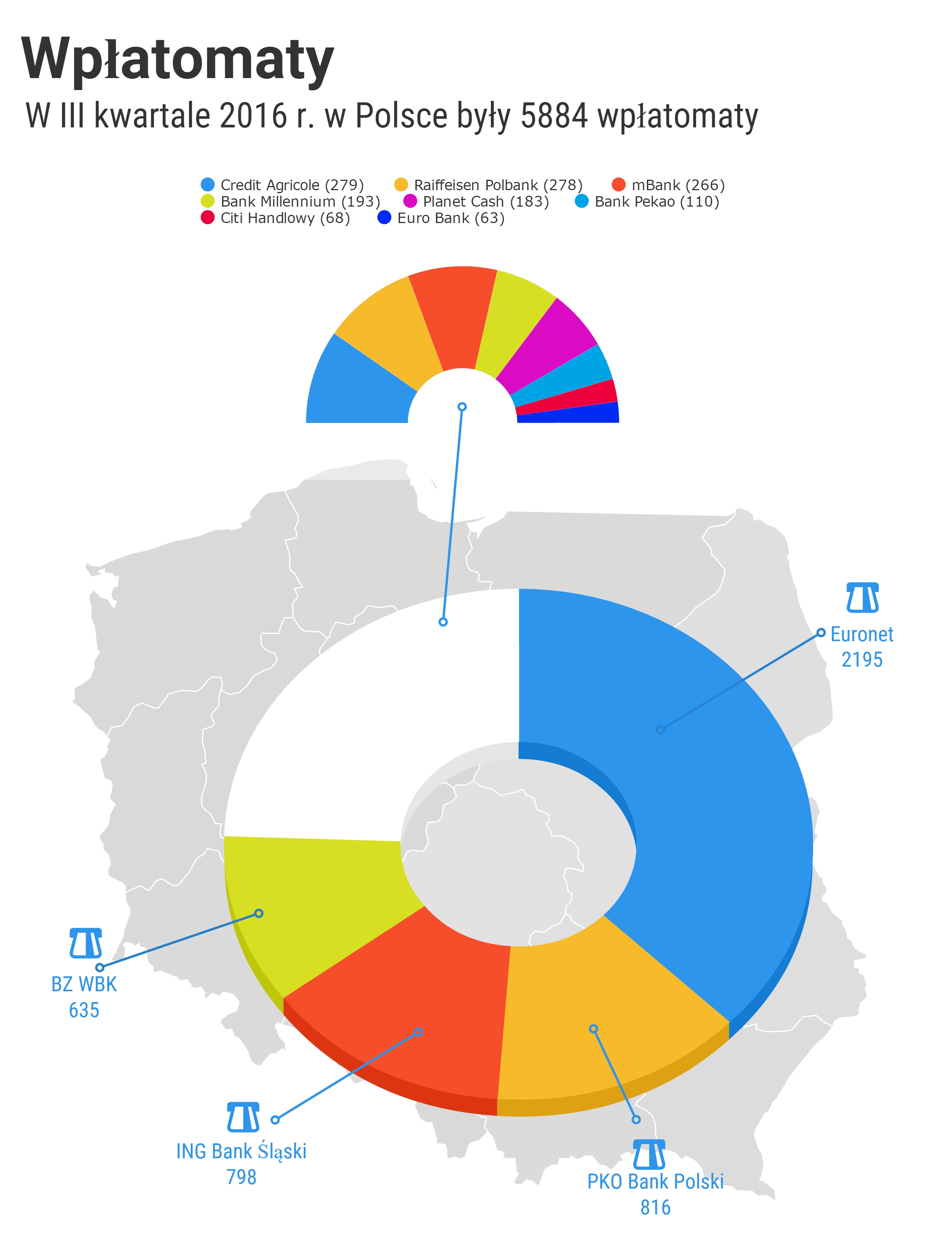 Największą siecią wpłatomatów w Polsce zarządza Euronet. Spośród banków najwięcej urządzeń mają PKO BP i Śląski