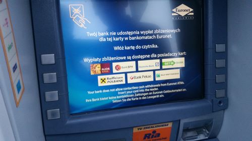 Natomiast spośród klientów banków z Polski z wypłat gotówki zbliżeniowo korzystać mogą jeszcze klienci ING Banku Śląskiego. Instytucja ta jako pierwsza uruchomiła sieć kilkuset bankomatów posiadających czytniki NFC. Obsługują one jednak wyłącznie posiadaczy kart wydanych przez Śląski. Wymianę infrastruktury na zbliżeniową prowadzi także BZ WBK, ale w jego bankomatach jeszcze nie można podejmować gotówki bezstykowo. Wprowadzenie możliwości wypłat bez wkładania karty do bankomatu deklaruje również właściciel sieci Planet Cash.