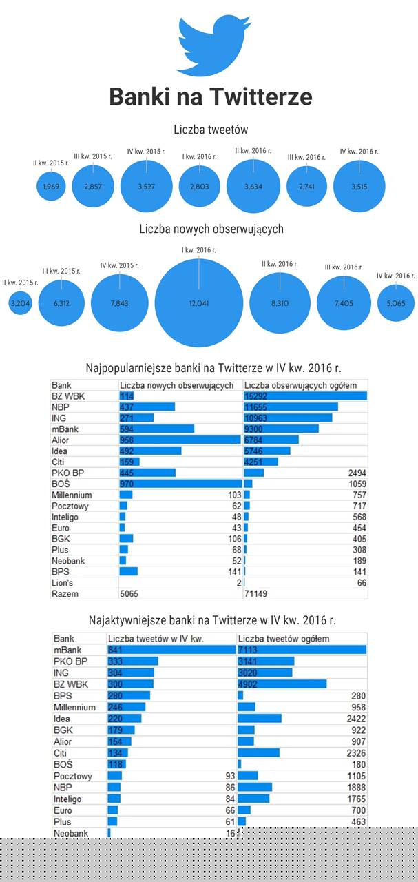 Profile banków na Twitterze można podzielić na dwie kategorie. Część kieruje treści do profesjonalistów i zamieszcza tam prognozy czy analizy ekonomiczne. Przykładem może być profil NBP, Citi Handlowego czy Pocztowego. Druga część ćwierkających banków chce natomiast dotrzeć do swoich klientów. Zamieszcza więc informacje o swojej ofercie, np. promocjach produktów a także ciekawostki czy konkursy. Do tej grupy należą profile np. mBanku czy debiutującego w minionym kwartale banku BPS.