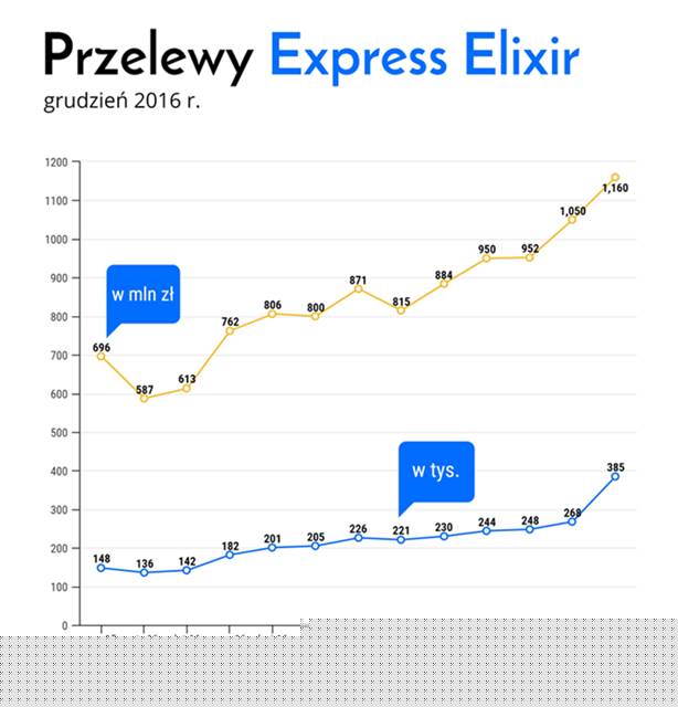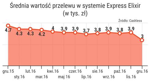Zmiany te, a więc o wiele szybszy przyrost liczby transakcji niż ich kwoty, oznaczają, że zmniejsza się średnia wartość przelewu wykonywanego za pośrednictwem systemu Express Elixir. W grudniu ubiegłego roku wynosiła ona ok. 3013 zł. Dla porównania w listopadzie było to ponad 3,9 tys. zł, a jeszcze w 2015 roku – ok. 4,7 tys. zł.