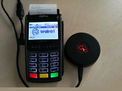 Rozwiązanie uznaję za bardzo ciekawe i perspektywiczne. Ale nie jest zupełnie bez wad. Aby zadziałało pracę po swojej stronie wykonać muszą operatorzy terminali – konieczna jest aktualizacja oprogramowania (choć w przypadku terminali akceptujących już Blika w stopniu minimalnym) oraz wyposażenie terminali w specjalne krążki, mogące odbierać sygnał BLE. Dziś bowiem jeszcze niewiele POS-ów ma wbudowaną tę technologię fabrycznie, choć pierwsze takie urządzenia już są na rynku. Krążki są kompatybilne z różnymi terminalami i na życzenie klienta mogą być zmniejszone czy też przygotowane w innym kształcie. Prototypowy krążek zaprojektowany przez Braintri wraz z terminalem wygląda tak: