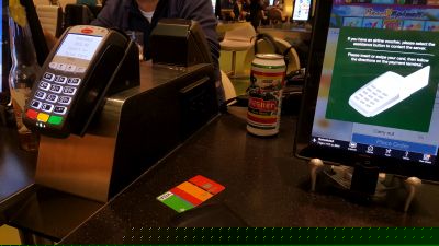 Po prostu naciskacie ikonę menu, wybieracie kanapkę lub drinka. Na ekranie pojawia się informacja, że należy włożyć kartę do znajdującego się obok terminala. Robicie to, potwierdzacie transakcję za pomocą PIN-u i gotowe. Po kilku minutach kelner przynosi Wam to, co zamówiliście.