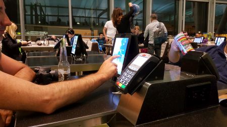 Zdaje się, że pomysłodawcy projektu, na który natrafiłem na lotnisku w Toronto, zdiagnozowali te same problemy, bo zaoferowali podróżnym bardzo ciekawe rozwiązanie. Na terenie lotniska są oczywiście sklepy, bary i restauracje, ale większość tradycyjnych poczekalni wyposażono w stoliki oraz iPady i terminale płatnicze. W oczekiwaniu na samolot, na tabletach można za darmo poprzeglądać internet, a przy okazji zamówić coś do jedzenia lub picia i od razu za to zapłacić.