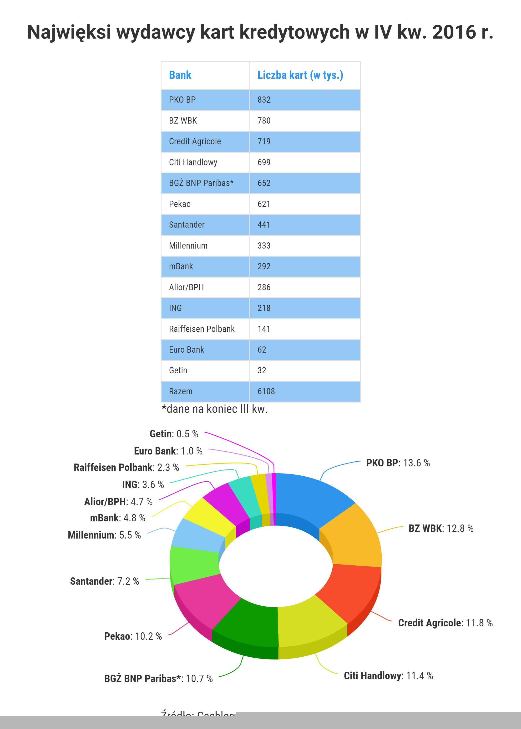Kolejne trzy instytucje w rankingu największych wydawców kart kredytowych nad Wisłą to Citi Handlowy, BGŻ BNP Paribas oraz Pekao. Wszystkie mają po ponad 600 tys. kart. Trzeba jednak podkreślić, iż BGŻ BNP Paribas jako jedyny z czołówki nie zdecydował się podać jeszcze danych aktualnych na koniec grudnia. Ze względu na fakt, że wyniki finansowe prezentuje dopiero za tydzień, w tabeli przy jego nazwie znajdziecie dane z września ubiegłego roku.