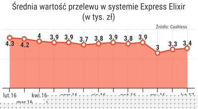 Co ciekawe luty był drugim miesiącem z rzędu, w którym wzrosła średnia wartość pojedynczego przelewu ekspresowego. Wynosiła ok. 3,4 tys. zł podczas gdy w styczniu było to 3,3 tys. zł. Jednak w pierwszych miesiącach ubiegłego roku średnie były o ok. tysiąc złotych wyższe. Roczny spadek średniej to efekt wykorzystania systemu Express Elixir przez Blika do z reguły drobnych przekazów P2P oraz rozszerzenia dostępności ekspresów dla klientów kilku dużych banków detalicznych, jak np. BGŻ BNP Paribas.
