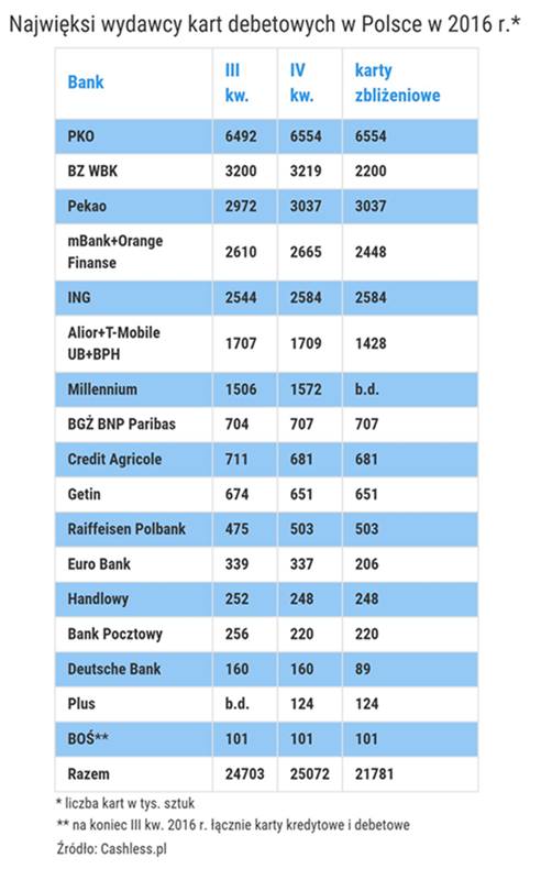 A na koniec jeszcze kilka uwag co do samych danych. Zbierałem je poprzez ankietę rozesłaną do biur prasowych poszczególnych instytucji. Nie wszystkie zdecydowały się udzielić odpowiedzi. Stąd brak w zestawieniu np. Nest Banku, Idea Banku i banków samochodowych Toyoty oraz Volkswagena. Między innymi z tego powodu ogólna liczba kart debetowych w raporcie jest niższa niż wynika to ze statystyk NBP. Według nich na koniec września ub. roku (to najświeższe dane jakie są dostępne) na rynku było 27,9 mln kart. Pamiętajcie jednak, że NBP uwzględnia również karty wydawane klientom biznesowym.