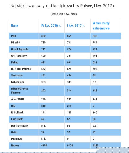 Największym wydawcą kart kredytowych w Polsce pozostaje PKO BP – ma ich bez mała 860 tys. Podobnie jak w poprzednim kwartale także i w I kw. 2017 r. na drugim miejscu był BZ WBK (781 tys. kart) a na trzecim Credit Agricole (724 tys.). Z wynikiem przekraczającym nieznacznie 700 tys. kredytówek na czwartym miejscu uplasował się Citi Handlowy. Większość kart kredytowych na polskim rynku ma funkcję zbliżeniową. Jednak ponad milion wciąż do przeprowadzenia transakcji wymaga włożenia do terminala.