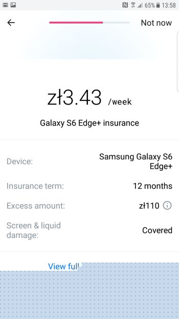 Jak widzicie, ubezpieczenie obejmuje wszelkie uszkodzenia telefonu i wyświetlacza. Można je wykupić tylko wtedy, gdy od nabycia smartfona nie upłynęło więcej niż pół roku. W przypadku mojego Samsunga S6 Edge+ tygodniowy koszt takiego zabezpieczenia, to 3,43 zł.