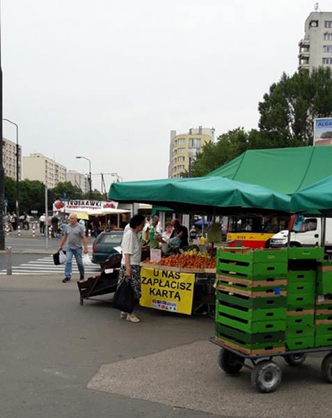 Poniższą fotografię wykonała przed chwilą moja szanowna małżonka na bazarku przy ulicy Wałbrzyskiej w Warszawie. Jak widzicie właścicielka jednego ze straganów umożliwia już swoim klientom dokonywanie płatności za warzywa kartą. Co więcej czyni z tego element wyróżniający stragan wśród konkurencji. O akceptacji kart informuje przechodniów za pośrednictwem dużego bannera. Korzysta z przenośnego terminala zbliżeniowego, obsługiwanego przez Pekao.
