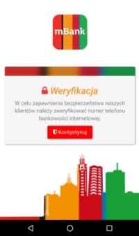 mBank ostrzega klientów przed nowym wirusem atakującym urządzenia z systemem operacyjnym Android. Złośliwe oprogramowanie podszywa się pod aplikację banku i wyświetla komunikat o konieczności potwierdzenia numeru telefonu.