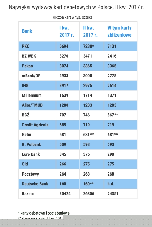 Największym wydawcą kart debetowych pozostaje PKO – w czerwcu miał ich 7,23 mln. Na kolejnych pozycjach znajdują się BZ WBK, Pekao, mBank wraz z marką Orange Finanse, ING oraz Millennium. Wzrost portfela kart debetowych zanotowała większość analizowanych banków. Z tym że dwa, a więc Getin i Deutsche Bank, nie zdecydowały się przekazać informacji na temat wielkości swojego portfela debetowego na koniec czerwca. W ich wypadku w tabeli prezentowane są więc dane archiwalne z I kw. bieżącego roku.