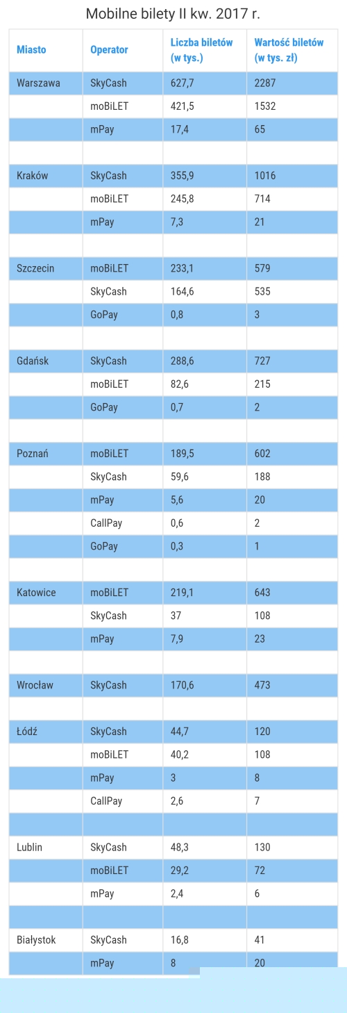 Muszę też zaznaczyć, że z dwóch miast, a więc z Łodzi i Katowic, nie otrzymałem pełnych danych. Zabrakło podziału sprzedaży na operatorów. W przypadku obu aglomeracji dokonałem więc samodzielnych szacunków, co oznacza, że mogłem pomylić się co do liczby lub wartości biletów kupionych przez użytkowników poszczególnych aplikacji.