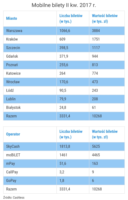 Jeżeli zaś chodzi o podział rynku między operatorów aplikacji mobilnych, liderem jest SkyCash. Jego sprzedaż w analizowanych ośrodkach miejskich przekroczyła 1,8 mln sztuk biletów. Miały wartość ponad 5,6 mln zł. Oznacza to, że pod względem liczby sprzedanych biletów udział SkyCash wynosi ok. 54 proc., a pod względem wartości – ponad 56 proc. rynku mobilnej sprzedaży biletów w największych miastach Polski.