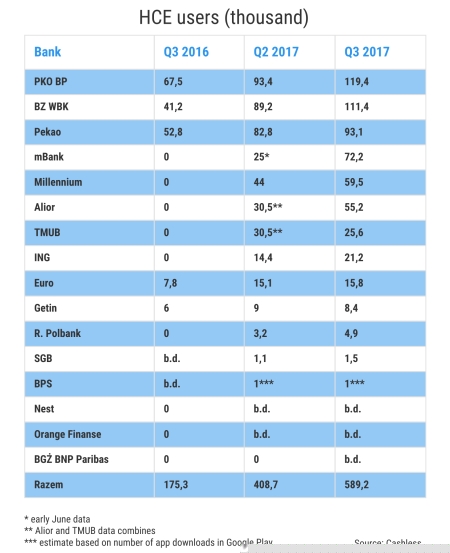 Two institutions - PKO and BZ WBK - can boast over 100 thousand customers using HCE technology
