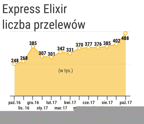 Jak podał KIR, w ubiegłym miesiącu przez Express Elixir przeszło ponad 488 tys. przelewów. Poprzedni rekord odnotowano we wrześniu, gdy zrealizowano 402 tys. transakcji, i był to pierwszy miesiąc, gdy liczba ta przekroczyła 400 tys. W październiku zaś transakcyjność systemu Express Elixir zbliżyła się już do 500 tys. W tym samym miesiącu ubiegłego roku system przetworzył 248 tys. przelewów. Odnotował więc wzrost ich liczby o 97 proc.