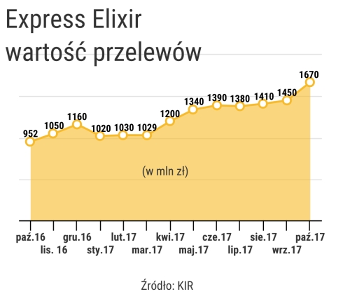 KIR podał ponadto, że wartość przelewów ekspresowych zrealizowanych w październiku wyniosła 1,67 mld zł. To także rekord, ale już nie tak spektakularny jak pod względem liczby. Poprzednio największą miesięczną wartość transakcji w systemie odnotowano we wrześniu bieżącego roku, gdy wyniosła ona 1,45 mld zł. Natomiast w październiku ubiegłego roku wartość transakcji Express Elixir wyniosła 952 mln zł, co oznacza, że w ciągu roku urosła o ok. 75 proc.