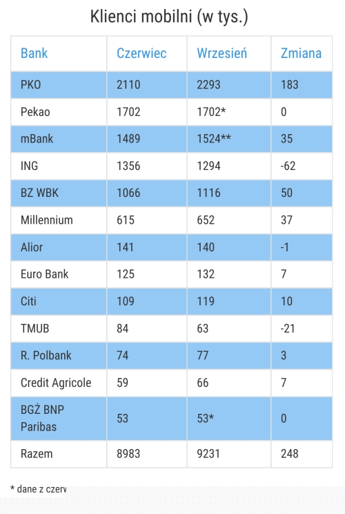 Na drugiej pozycji uplasował się Pekao. Z tym, że bank odmówił podania aktualnej liczby mobilnych klientów. W tabeli widzicie więc dane z czerwca. Podobnie jest w przypadku BGŻ BNP Paribas, ale bank obiecał dosłać aktualne dane. Gdy to się stanie, zaktualizuję tabelę. Natomiast na trzeciej pozycji znajduje się mBank, który ma ponad 1,5 mln klientów zarządzających rachunkiem przez smartfony lub tablety. To klienci, którzy zalogowali się przynajmniej raz na rachunek z urządzenia mobilnego w całym III kw. Liczba takich, którzy logowali się w ten sposób w samym wrześniu jest zapewne inna, ale przedstawiciele instytucji deklarują, że nie mają możliwości jej wyliczenia.