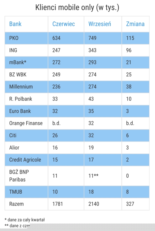 Jeżeli chodzi o klientów mobile only, czyli takich którzy logowali się na swój rachunek wyłącznie przez urządzenia mobilne, to we wrześniu banki miały ich już ponad 2,1 mln. Tu też prym wiedzie PKO BP. Miał prawie 750 tys. klientów mobile only, o ponad 100 tys. więcej niż w czerwcu. Warto zwrócić uwagę na znaczny przyrost (o 96 tys.) tego rodzaju użytkowników rachunków w ING. Pozwoliło mu to na przesunięcie się z pozycji czwartej w czerwcu na drugą we wrześniu. Na trzecim miejscu znajduje się mBank, ale tu też muszę zrobić zastrzeżenie, że to dane kwartalne. W samym wrześniu klientów mobile only było zapewne nieco więcej niż wskazane w tabeli 293 tys.