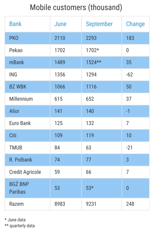 Data I obtained from thirteen of the biggest banks on the Polish market suggests that in September they had a total of 9.2 million customers who logged in to their accounts from a mobile device at least once during that month. It's an increase by approximately 0.25 million compared to June, when there were almost 9 million mobile customers.