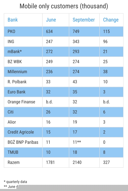 As for mobile only users - customers who logged in to their account exclusively via mobile devices - their number exceeded 2.1 million in September. This category is also dominated by PKO BP. The bank had almost 750 thousand mobile only customers - over 100 thousand more than in June. It's worth noticing that ING had a significant increase in the number of this type of account users (96 thousand). This allowed the bank to move up from June's fourth place to second in our September report. mBank is in third place - with the stipulation that the data is for the whole quarter. In September alone, the number of mobile only customers was probably slightly higher than the 293 thousand indicated in the table.