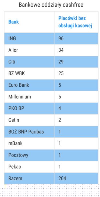 Jak widzicie posiadaniem największej liczby placówek bez kasjerów chwali się ING – ma ich prawie 100. Dużo takich oddziałów mają też Alior, Citi i BZ WBK – każda z tych instytucji po kilkadziesiąt. Najmniej, bo po jednym oddziale cashfree znajduje się w sieci Pocztowego, Pekao, BGŻ BNP Paribas i mBanku. Ten ostatni deklaruje, że ma jeszcze ok. 100 mKiosków, w których także nie ma gotówki. Ale placówki te należą do zewnętrznej spółki banku, i nie można ich zaliczyć do oddziałów. Stąd nie uwzględniłem ich w zestawieniu. Ciekawe, jak sieć placówek cashfree będzie się rozwijała w przyszłości – będę starał się tego rodzaju zestawienia przygotowywać cyklicznie aby pokazać trend.