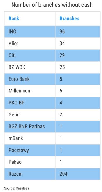 I decided to find out which of the banks operating in Poland already have cash free branches - with no registers and no clerks counting bills. I sent out a survey to about a dozen biggest banks on the Polish market. It turns out 11 have cash free branches at the moment. In total, there are over 200 of them. You can see detailed information in the table below.