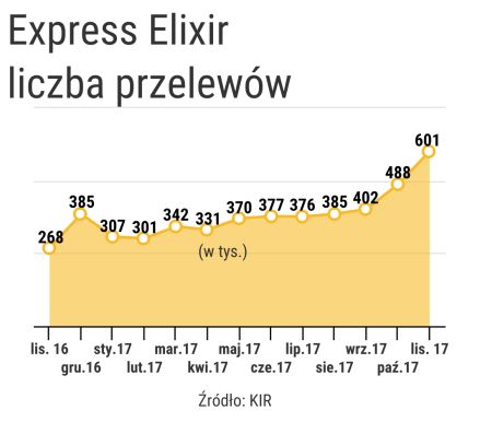 W listopadzie przez system Express Elixir przeszło ponad 601 tys. przelewów. Poprzedni rekord, odnotowany w październiku bieżącego roku, został więc pobity o ponad 100 tys. przelewów (w październiku rozliczono ok. 488 tys. przelewów ekspresowych). W listopadzie 2016 r. w systemie Express Elixir wykonano ok. 268 tys. przelewów. Rok do roku system odnotował więc wzrost liczby transakcji o 124 proc.