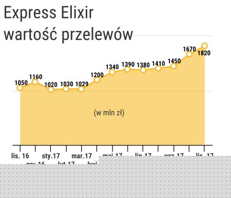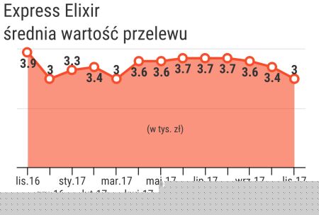 Express Elixir odnotował również rekord, jeśli idzie o wartość zrealizowanych przelewów. W listopadzie wyniosła ona ok. 1,82 mld zł. Tymczasem poprzedni rekord, zanotowany w październiku bieżącego roku, wynosił ok. 1,67 mld. Natomiast w listopadzie ubiegłego roku wartość przelewów rozliczonych przez Express Elixir wynosiła ok. 1,05 mld zł.