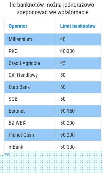Natomiast klienci mBanku mogą deponować w wybranych jego urządzeniach maksymalnie 50 sztuk. Instytucja chwali się jednak, że niektóre jej wpłatomaty mają już możliwość przyjęcia jednorazowo nawet 300 banknotów. Z kolei wpłatomaty ING pozwalają na zdeponowanie jednorazowo 100 banknotów (50 sztuk plus drugie 50 w opcji dołóż banknoty). Poniżej tabelka z zestawieniem operatorów. Danych na temat limitów nie przysłali operatorzy sieci wpłatomatów BPS, Cashline i Pekao.