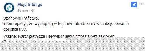 – Informujemy , że występują w tej chwili utrudnienia w funkcjonowaniu aplikacji IKO. Karty płatnicze i serwis Inteligo działają bez zakłóceń. Za utrudnienia przepraszamy – napisał bank.