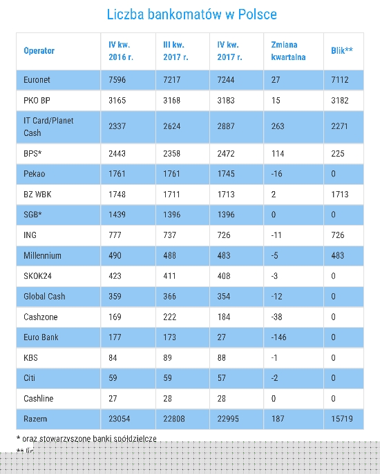 Natomiast największą siecią bankomatów na polskim rynku pozostaje Euronet, który na koniec grudnia miał ponad 7,2 tys. urządzeń. Drugą pozycję zajmuje PKO – ma prawie 3,2 tys. bankomatów, a na trzecim miejscu jest wspomniana wyżej firma IT Card z siecią Planet Cash. Łącznie na rynku funkcjonuje bez mała 23 tys. bankomatów. Ponad 15,7 tys. akceptuje wypłaty gotówki Blikiem.