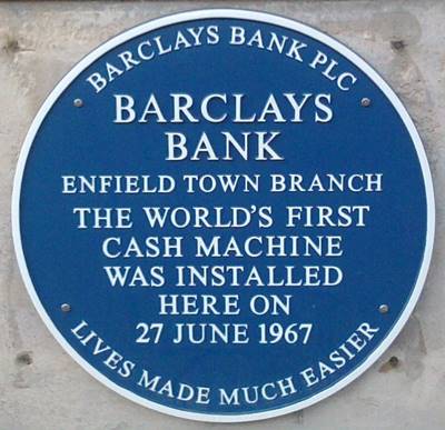 Szkocki wynalazca nigdy nie opatentował swojego pomysłu, bo musiałby ujawnić system kodów służących do potwierdzania transakcji. Zadowolił się nagrodami przyznawanymi przez banki i Orderem Imperium Brytyjskiego, którym został odznaczony w 2004 r. Dzięki temu, że bankomaty jego pomysłu nie były chronione prawami majątkowymi, bardzo szybko zaczęły się upowszechniać. Zaledwie trzy lata po zainstalowaniu pierwszego z nich, na całym świecie działało już 781 automatów, z czego 595 w Wielkiej Brytanii. Na zdjęciu okolicznościowa tablica upamiętniająca postawienie pierwszego bankomatu.