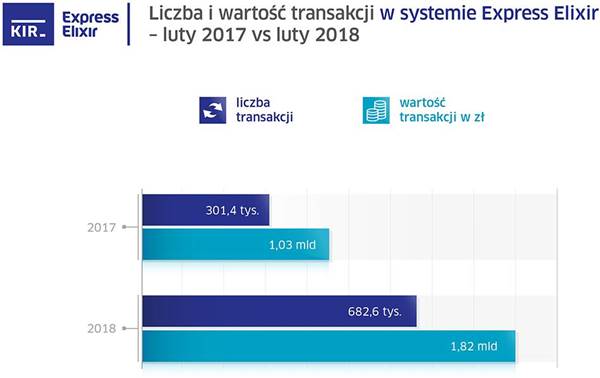 Z danych KIR-u wynika, że w lutym wykonaliście za pośrednictwem systemu Express Elixir bez mała 683 tys. przelewów o łącznej wartości prawie 1,82 mld zł. W porównaniu z lutym 2017 roku oznacza to wzrost liczby transakcji o ponad 126 proc. oraz ich wartości o 78 proc. Poniżej przedstawiająca to grafika przygotowana przez KIR.