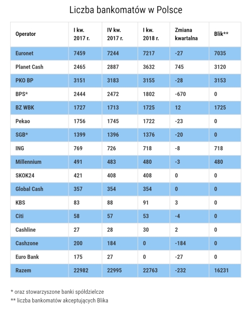 Decyzja Cardtronics jest jednym z czynników decydujących o tym, że liczba bankomatów działających na polskim rynku kolejny kwartał z rzędu zmniejszyła się. Na koniec marca funkcjonowało 22763 bankomatów, podczas gdy w grudniu ub. roku było ich 22995 a w marcu 2017 r. – 22982. Innym czynnikiem mającym na to wpływ może być demontaż urządzeń sezonowych zlokalizowanych w zimowych ośrodkach turystycznych. Wkrótce większość z nich pojedzie zapewne nad morze.