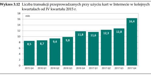 Jak widzicie na powyższym wykresie autorstwa NBP w ostatnim kwartale ubiegłego roku odnotowano 16,4 mln transakcji kartami w środowisku e-commerce. To o 24 proc., a więc bez mała o jedną czwartą więcej niż w III kw. ubiegłego roku. W porównaniu z IV kw. 2016 r., kiedy płatności internetowych było 11,8 mln, wzrost wyniósł bez mała 40 proc.
