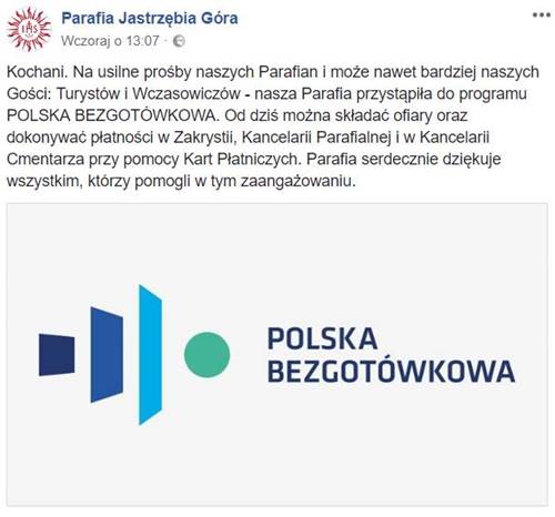 Jak się okazuje, do programu rozwoju sieci akceptacji kart w Polsce prowadzonego przez fundację Polska Bezgotówkowa, przystąpiła właśnie parafia katolicka z Jastrzębiej Góry. Jak informuje na swoim profilu na Facebooku, dzięki terminalom obsługiwanym przez firmę Topcard można składać bezgotówkowe ofiary na tacę i wnosić inne płatności w zakrystii, kancelarii parafialnej oraz w kancelarii cmentarza parafialnego.